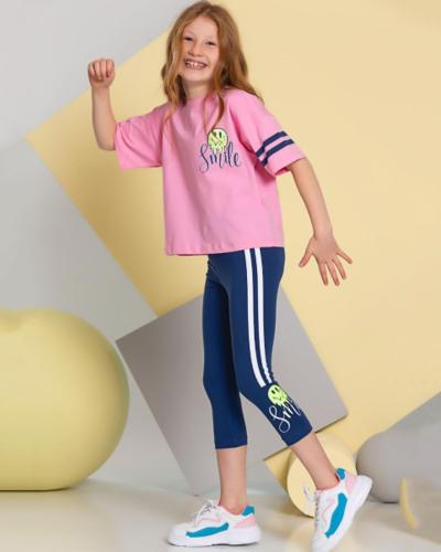 Укороченная футболка со спущенным рукавом  и бриджи делают летний комплект оригинальным и стильным.  Костюм выполнен из мягкого трикотажа кулирка.